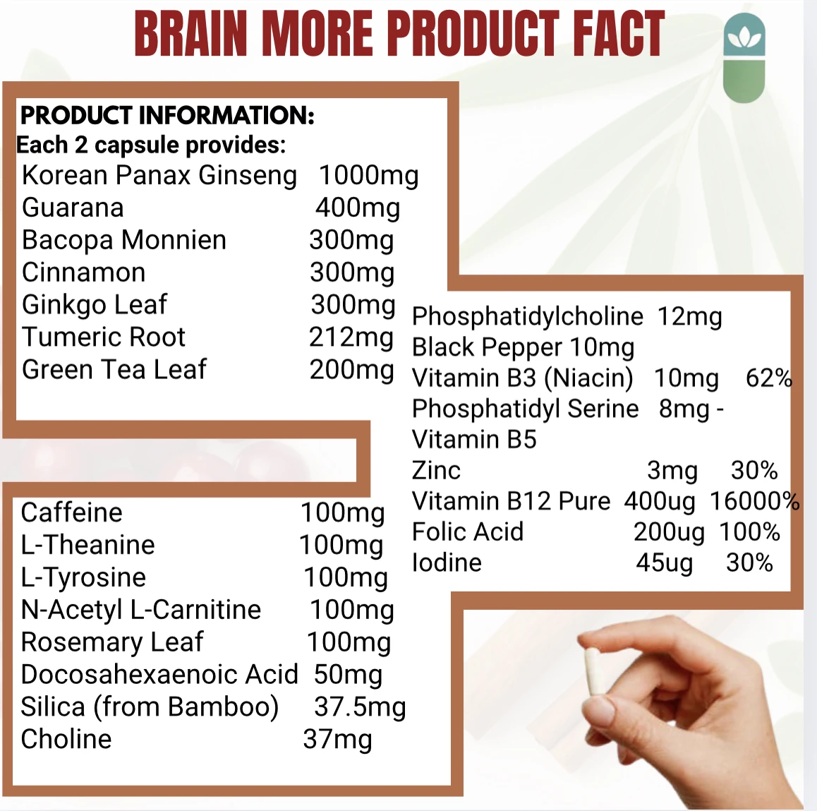 This unique and comprehensive formula contains a special combination of herbs, vitamin and mineral ingredients that support both cognitive function and energy levels, by providing valuable additional nutritional energy to your brain and body backed by science .