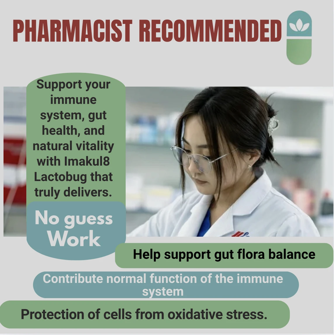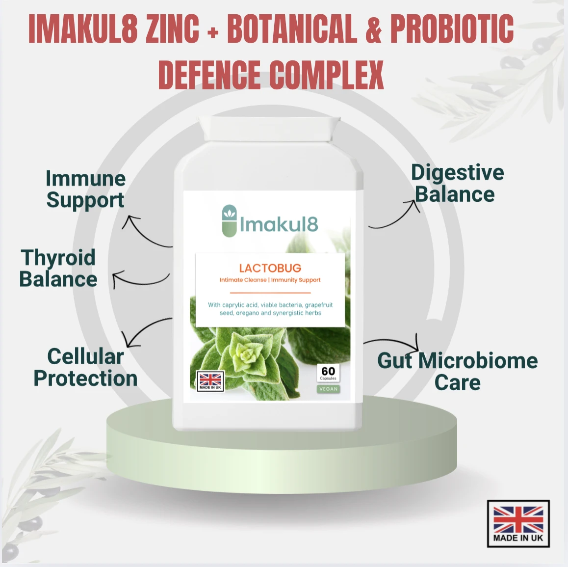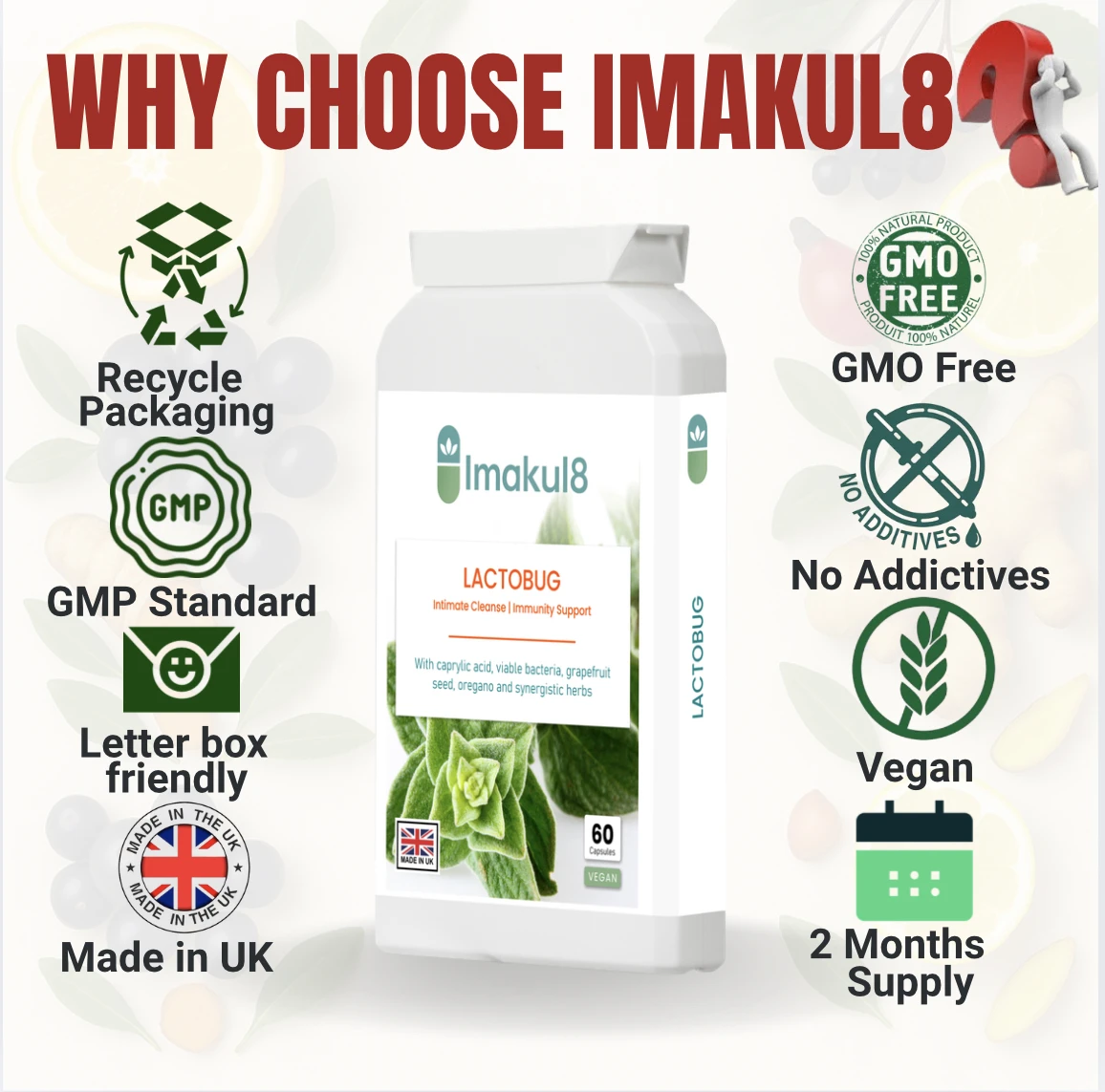 Discover Imakul8 LACTOBUG™, an advanced gastrointestinal complex formulated to support daily digestive balance using natural plant extracts, caprylic acid, friendly bacteria cultures, glucosamine HCl and essential nutrients.