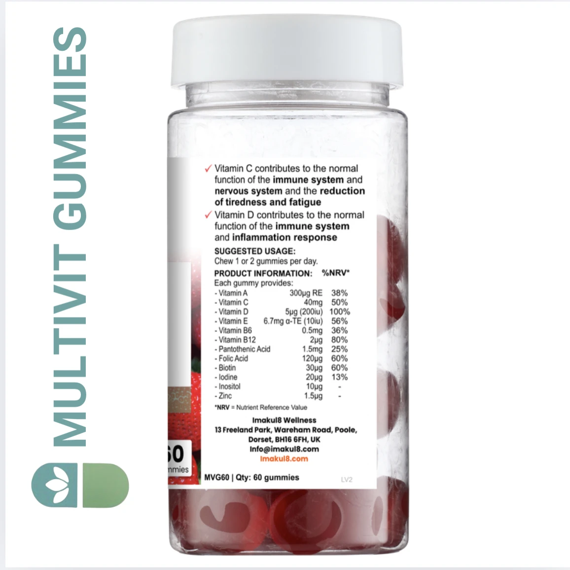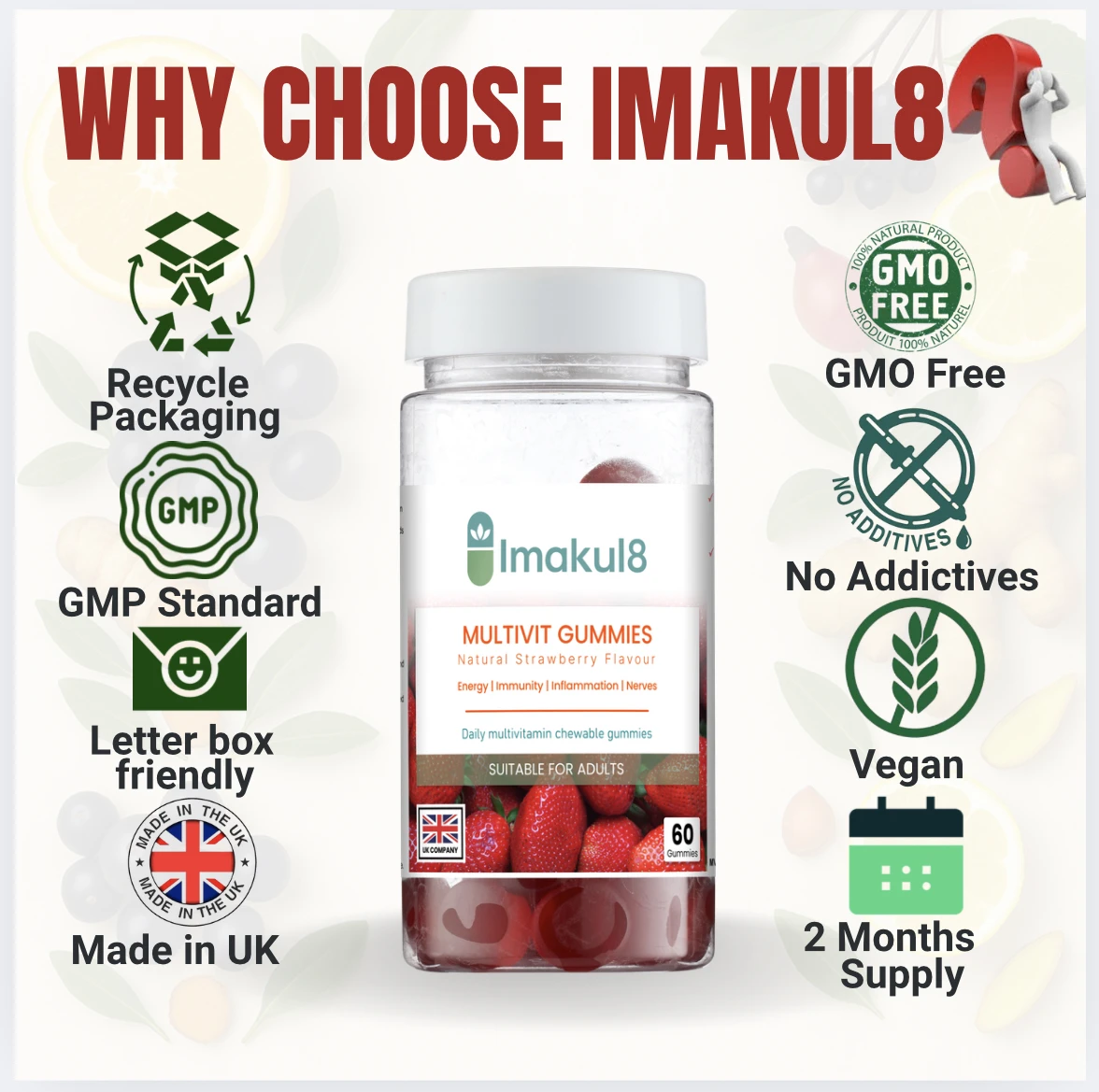Imakul8 Multivit Gummies are a convenient and great-tasting way to support everyday health and wellbeing. This balanced multivitamin formula provides Vitamins A, C, D and E, along with key B-vitamins, Biotin, Iodine, and Zinc, making it ideal for daily nutritional support.
