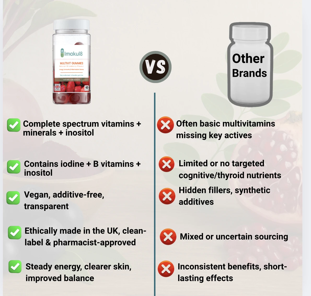 Vitamin D also contributes to the maintenance of normal bones and teeth, while Vitamin E contributes to the protection of cells from oxidative stress. With added Folic Acid, Iodine, Inositol and Zinc, Imakul8 Multivit Gummies provide gentle, everyday nutritional support in an easy-to-take gummy format.