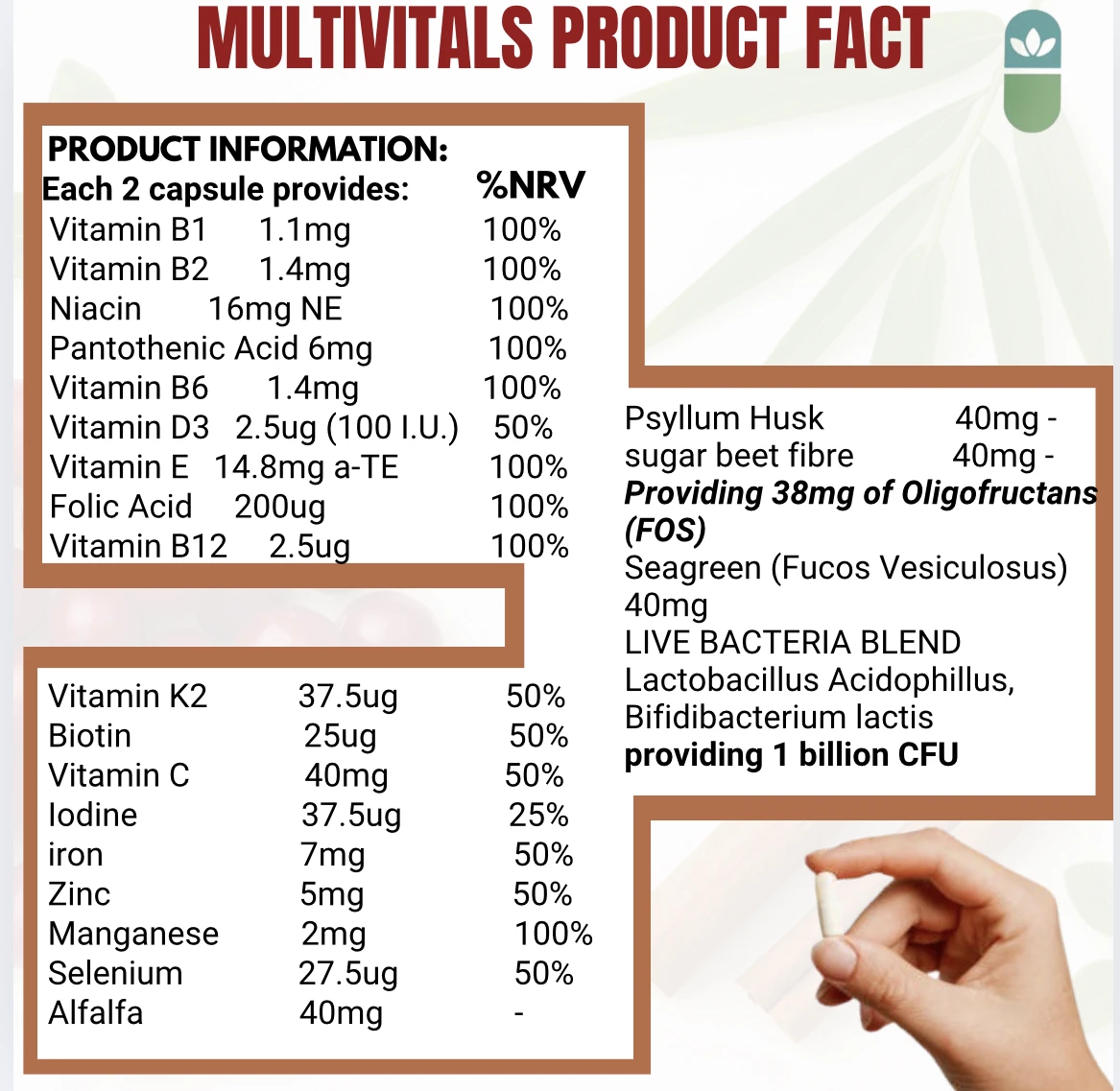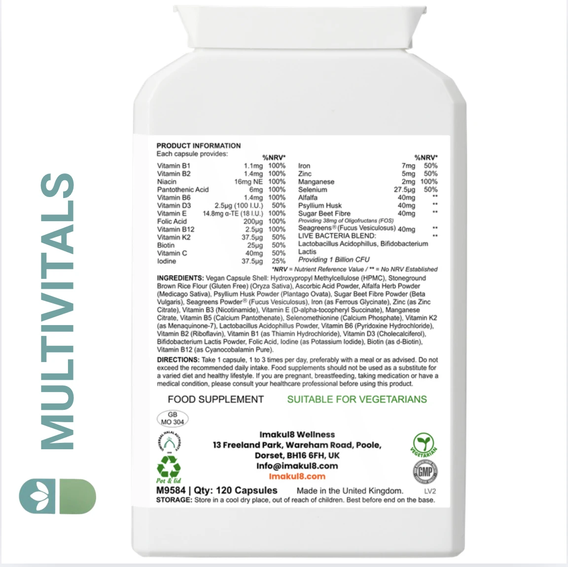 Imakul8 Multivitals is enhanced with Psyllium Husk, Sugar Beet Fibre, and oligofructans (FOS), plus a live bacteria blend of Lactobacillus acidophilus and Bifidobacterium lactis providing 1 billion CFU. Botanical ingredients including Seagreen (Fucus vesiculosus) and Alfalfa complete this all-in-one daily formula for nutritional balance and digestive support.