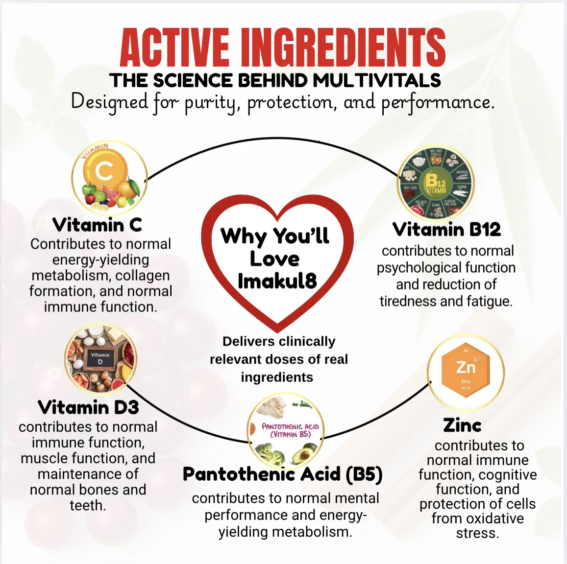 Imakul8 Multivitals is a comprehensive multivitamin and mineral food supplement designed to support everyday health and wellbeing. The formula provides 100% NRV of key B-vitamins, including Vitamins B1, B2, B6, B12, Niacin, Pantothenic Acid and Folic Acid, which contribute to normal energy-yielding metabolism, normal psychological function, and the reduction of tiredness and fatigue.