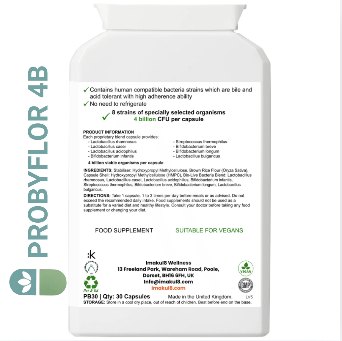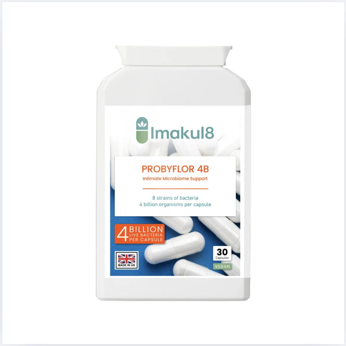 Imakul8 PROBYFLORA 4B is an advanced vaginal probiotic supplement formulated to support a healthy intimate microbiome, natural pH balance, and yeast harmony. Each capsule delivers 4 billion live cultures from 8 carefully selected probiotic strains, traditionally associated with vaginal and intimate flora support.