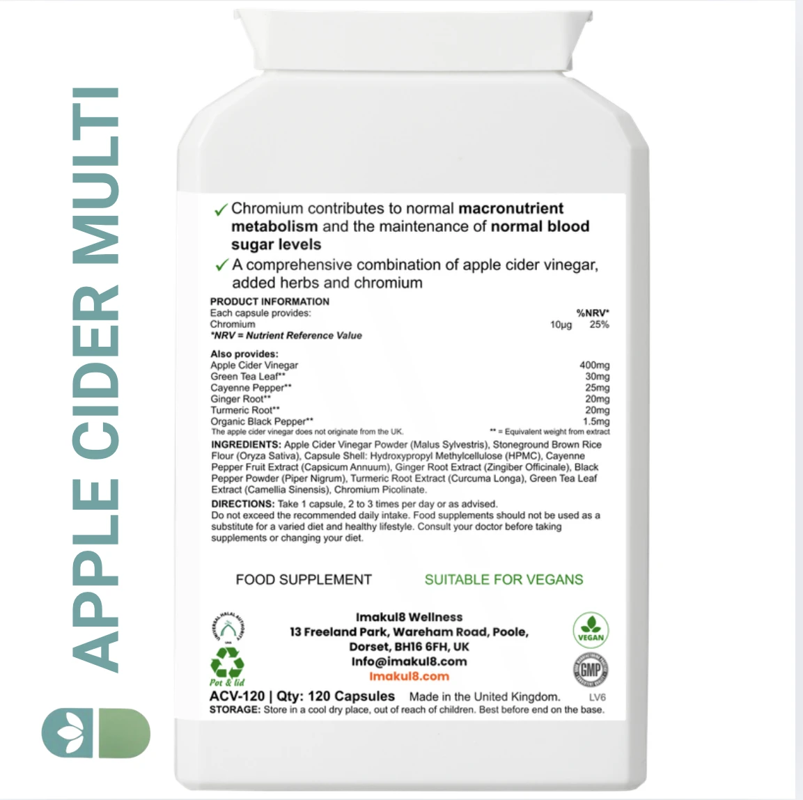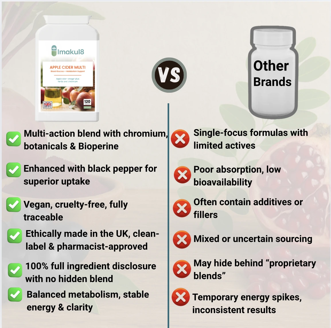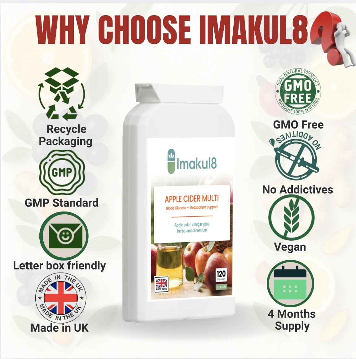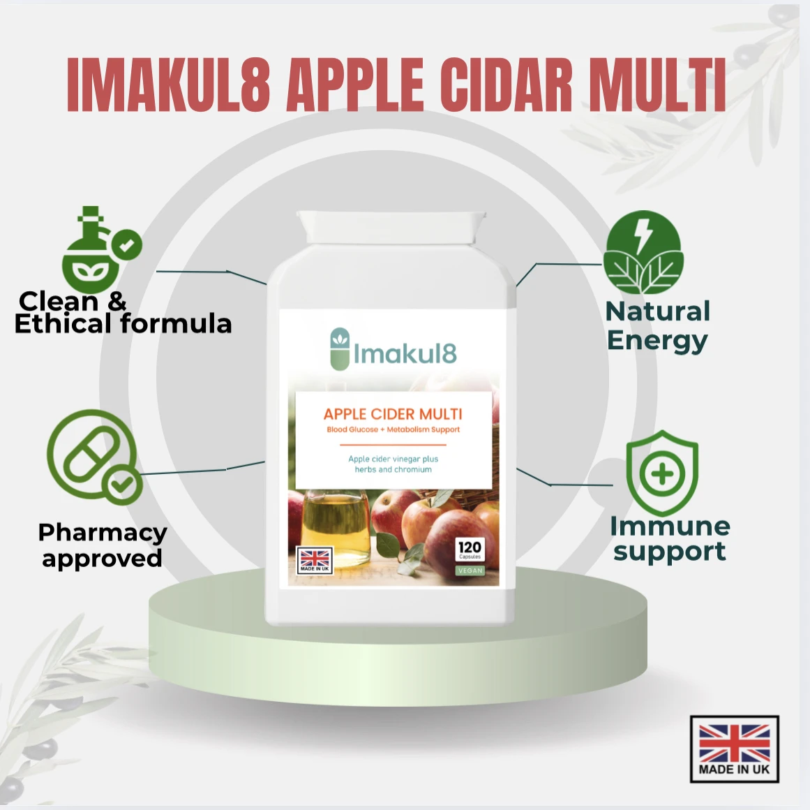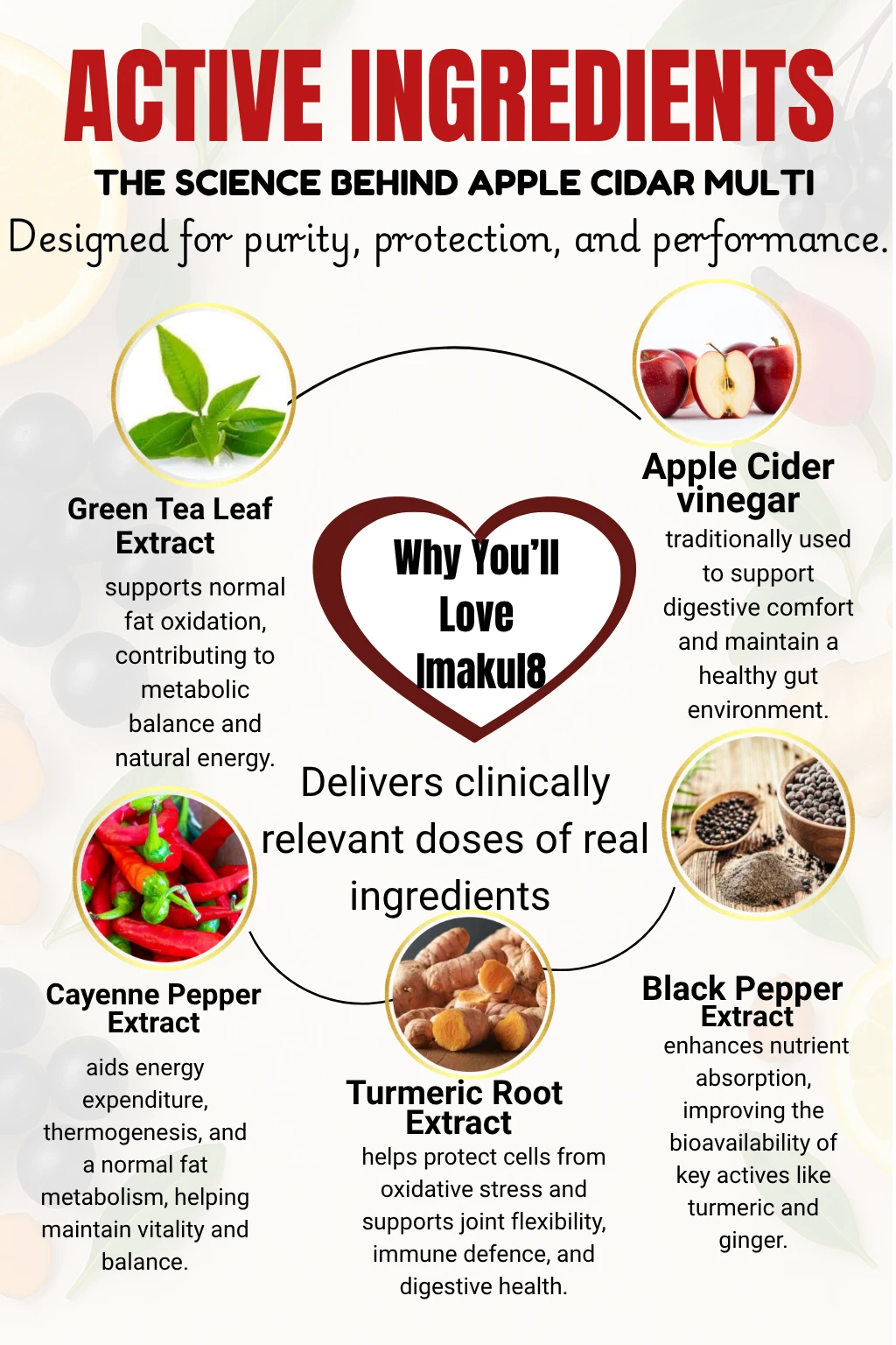 Experience balance and vitality with Imakul8 Apple Cider Multi — your daily support for metabolism, digestion, and natural energy. This advanced formula combines Apple Cider Vinegar, Green Tea, Turmeric, Cayenne Pepper, and Ginger Root, enhanced with Chromium to help maintain healthy blood sugar levels.