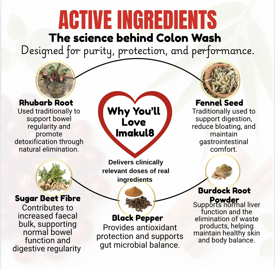 Imakul8 COLON WASH is ideal for individuals seeking a natural, plant-led way to maintain gut comfort, support everyday wellbeing and reinforce healthy dietary habits.