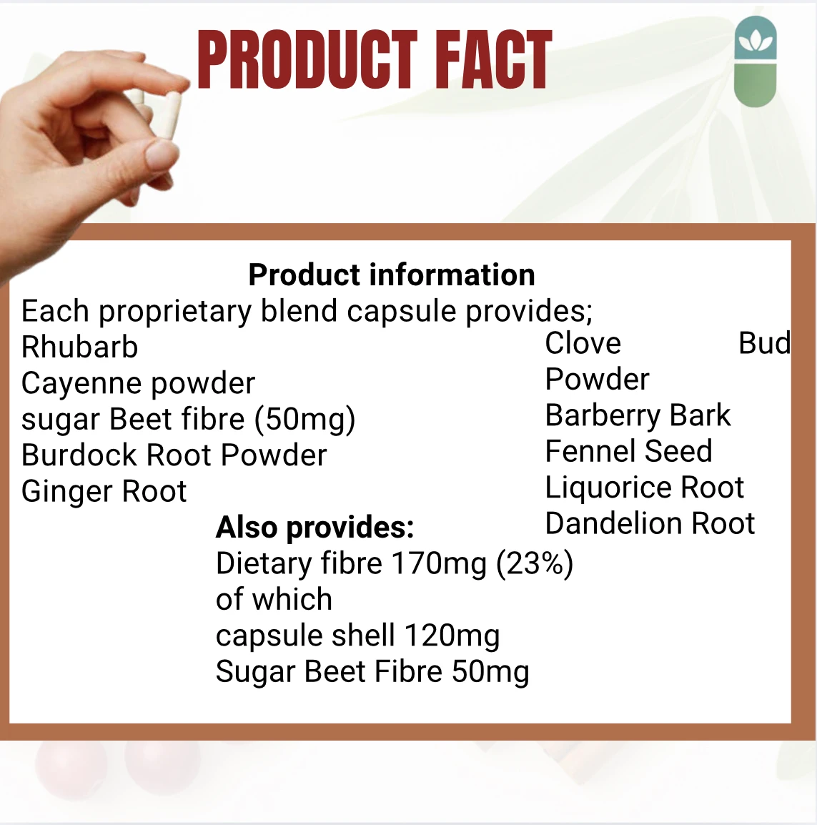 At the heart of the blend is Sugar Beet Fibre, an approved and scientifically recognised source of dietary fibre that contributes to an increase in faecal bulk a key factor in maintaining normal digestive rhythm. Surrounding it is a curated selection of herbs and spices traditionally used for internal balance and comfort, including Rhubarb Powder, Burdock Root, Ginger Root, Liquorice Root, Cayenne, Fennel Seed, Clove Bud, Barberry Bark and Dandelion Root.