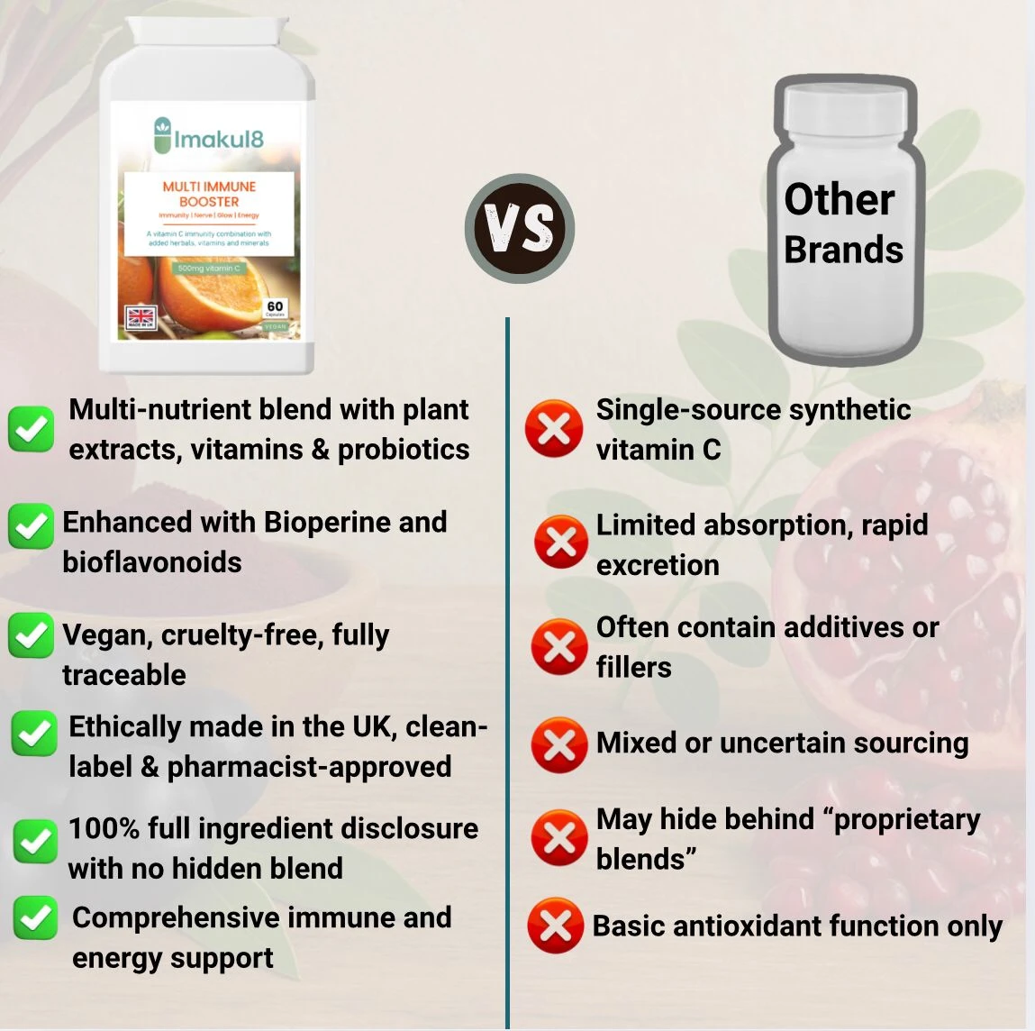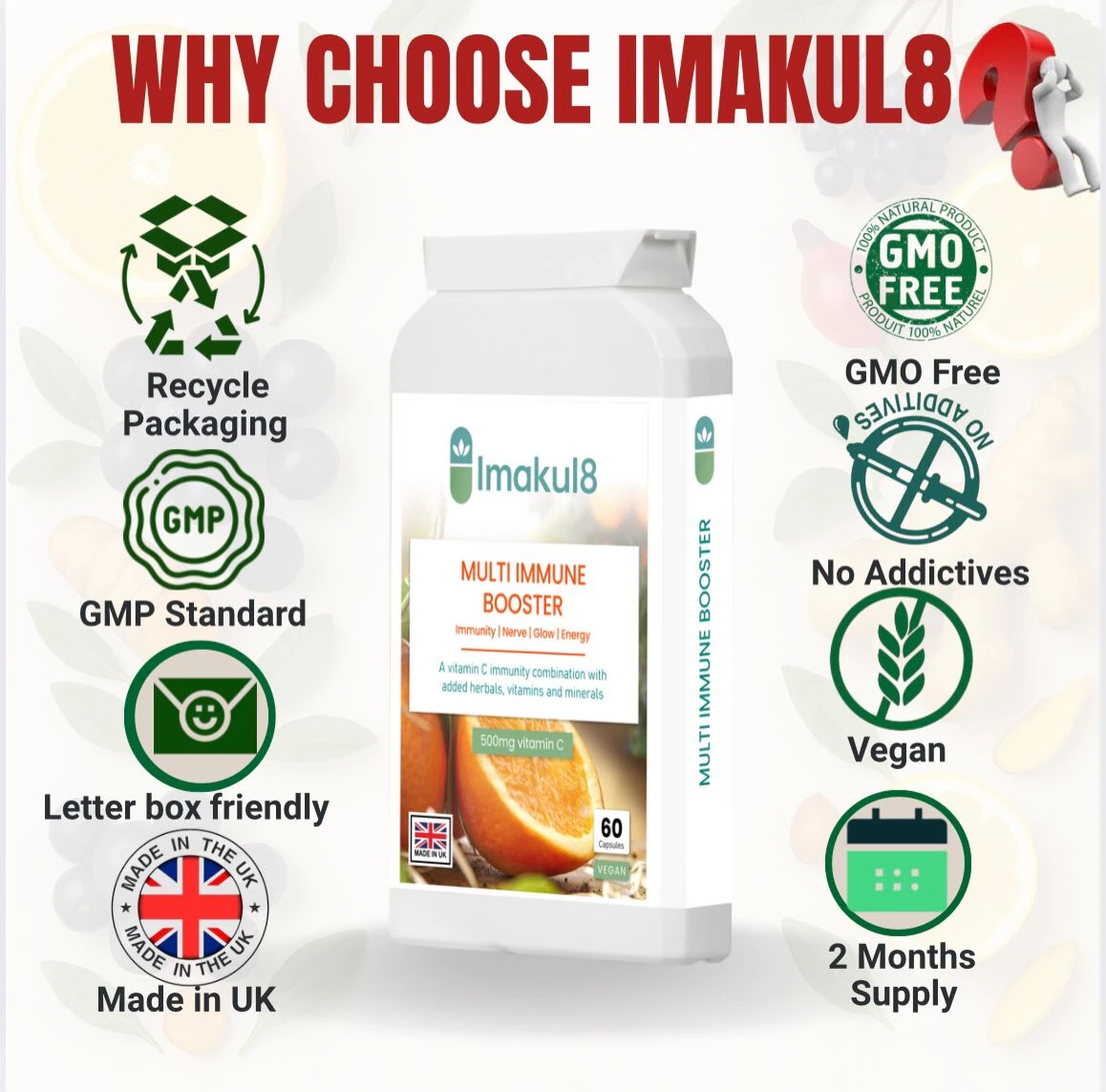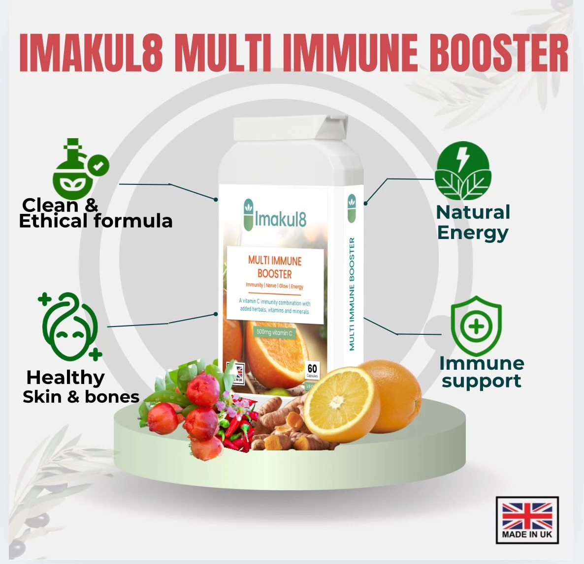 Imakul8 Multi Immune Booster is a luxury, high-potency immunity formula designed to strengthen your body’s natural defences, enhance resilience, and support overall vitality.