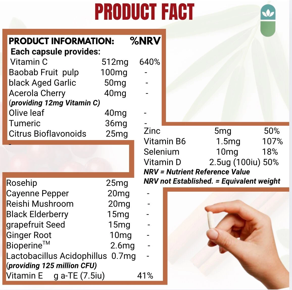 Formulated with a synergistic blend of Vitamin C, D, Zinc, and B6, alongside Baobab, Elderberry, Acerola Cherry, Olive Leaf, Black Garlic, Reishi Mushroom, Turmeric, and Ginger, this supplement delivers comprehensive antioxidant and immune protection.
