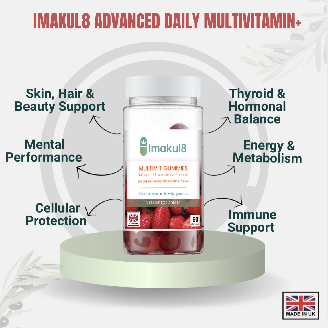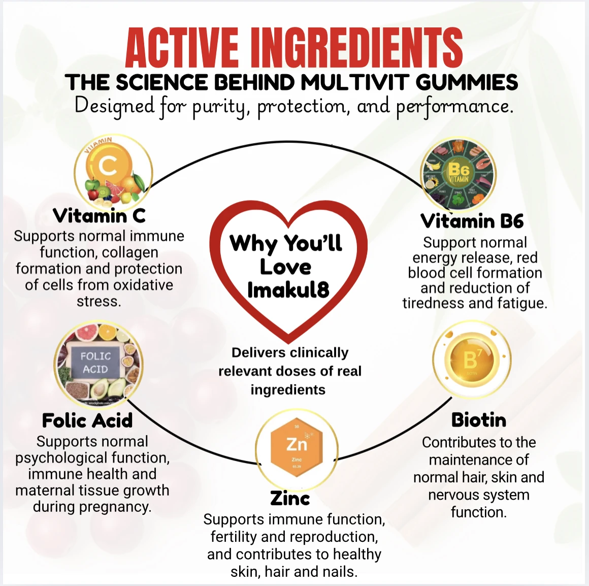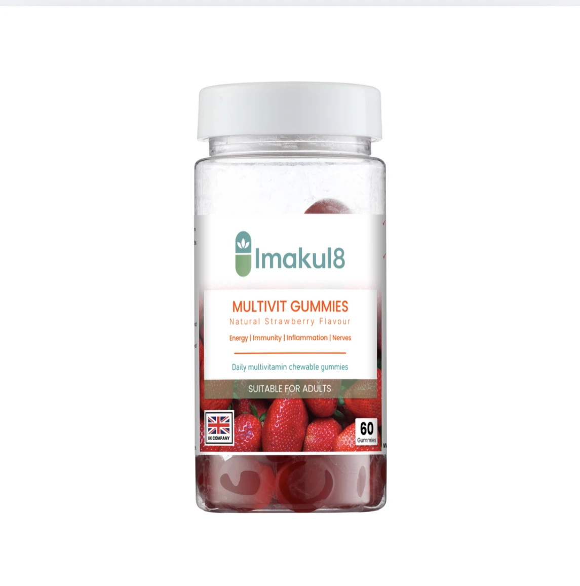 Imakul8 Multivit Gummies are a convenient and great-tasting way to support everyday health and wellbeing. This balanced multivitamin formula provides Vitamins A, C, D and E, along with key B-vitamins, Biotin, Iodine, and Zinc, making it ideal for daily nutritional support.