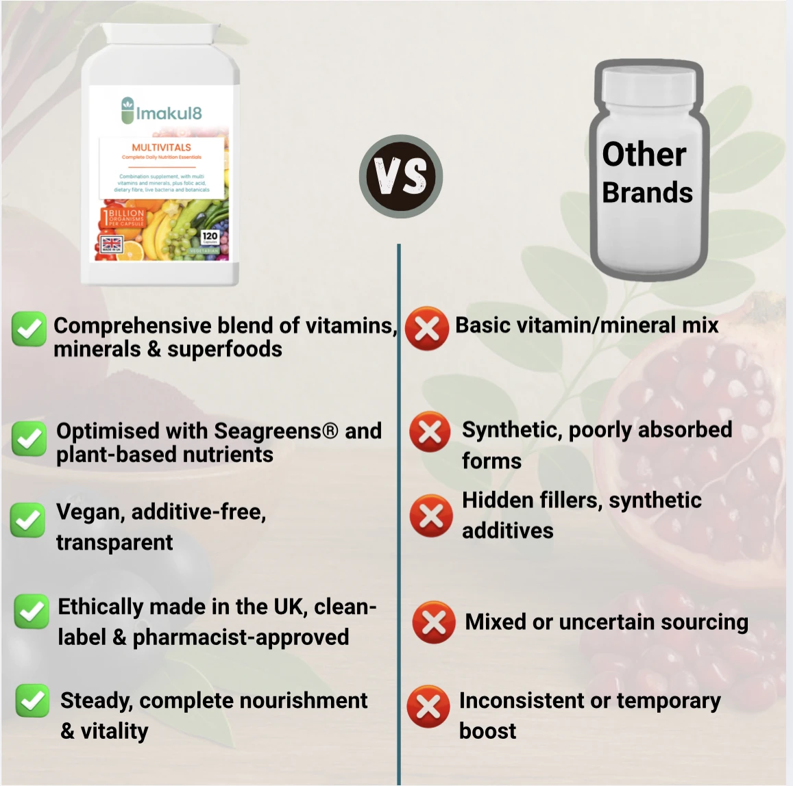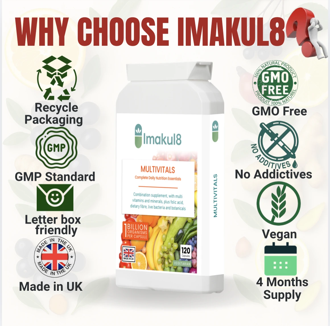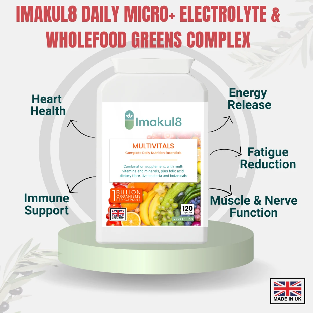Imakul8 Multivitals is enhanced with Psyllium Husk, Sugar Beet Fibre, and oligofructans (FOS), plus a live bacteria blend of Lactobacillus acidophilus and Bifidobacterium lactis providing 1 billion CFU. Botanical ingredients including Seagreen (Fucus vesiculosus) and Alfalfa complete this all-in-one daily formula for nutritional balance and digestive support.