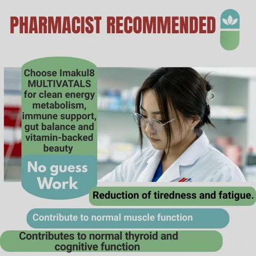 Imakul8 Multivitals is a comprehensive multivitamin and mineral food supplement designed to support everyday health and wellbeing. The formula provides 100% NRV of key B-vitamins, including Vitamins B1, B2, B6, B12, Niacin, Pantothenic Acid and Folic Acid, which contribute to normal energy-yielding metabolism, normal psychological function, and the reduction of tiredness and fatigue.