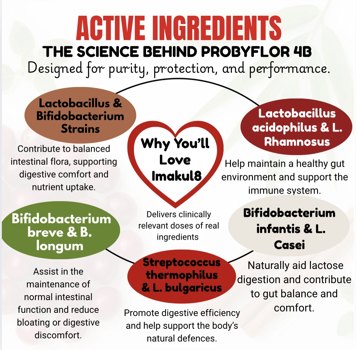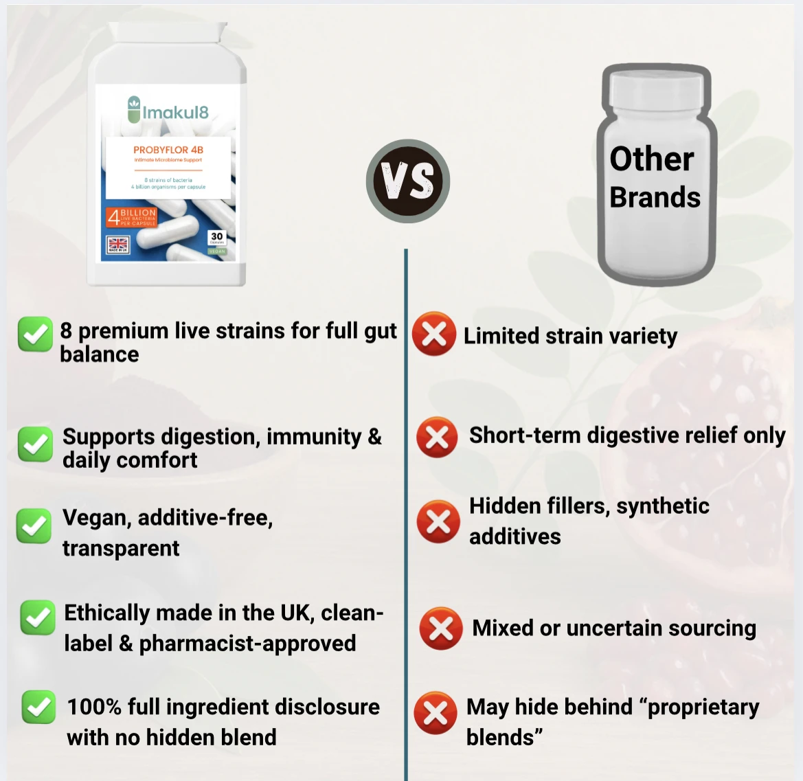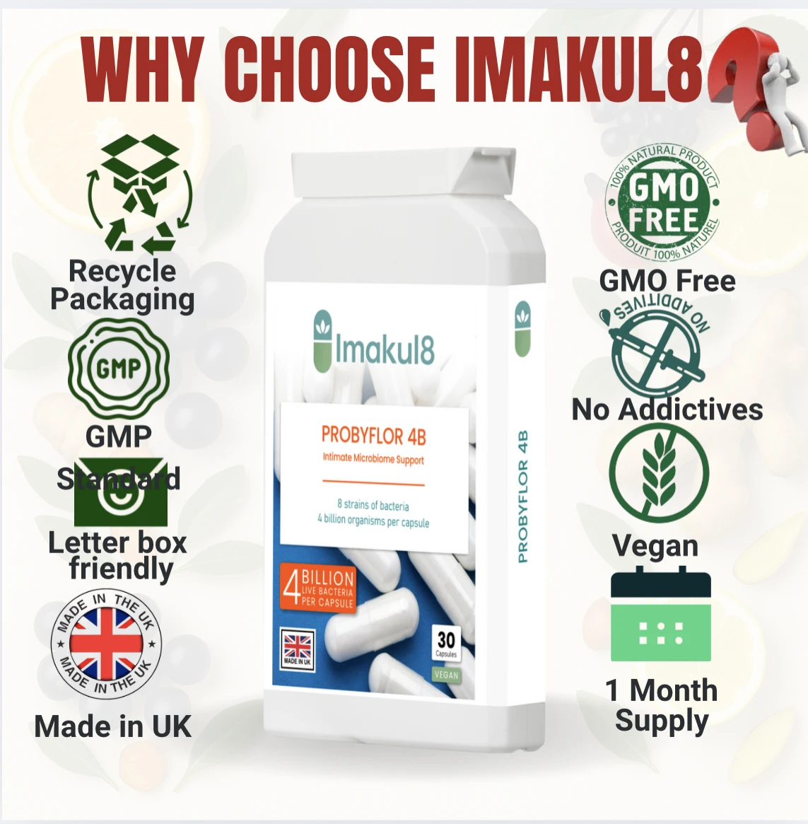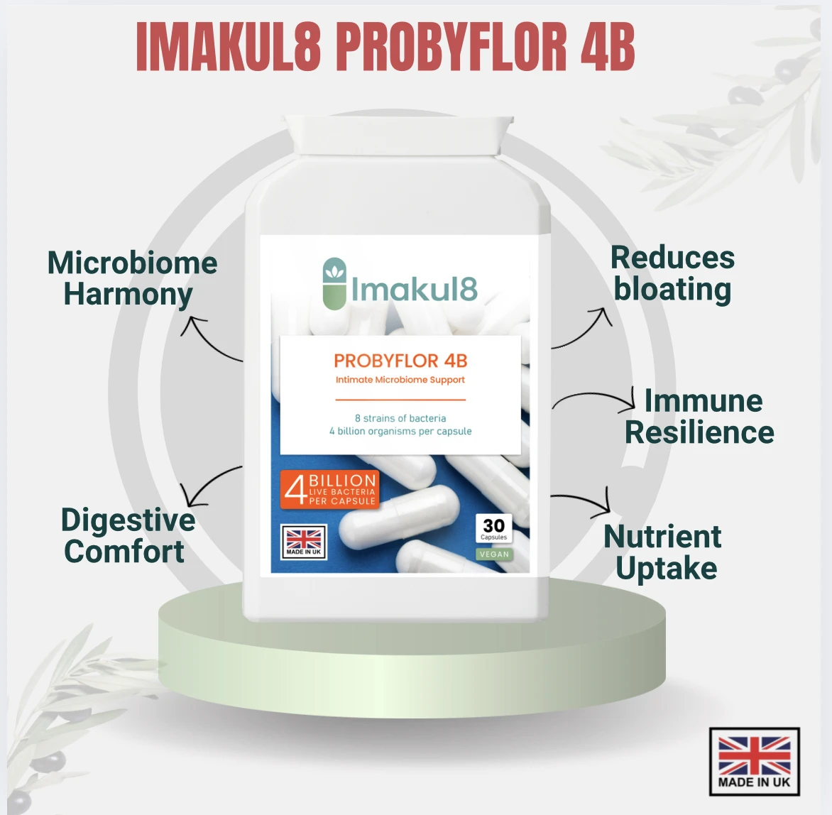 Imakul8 PROBYFLORA 4B is an advanced vaginal probiotic supplement formulated to support a healthy intimate microbiome, natural pH balance, and yeast harmony. Each capsule delivers 4 billion live cultures from 8 carefully selected probiotic strains, traditionally associated with vaginal and intimate flora support.